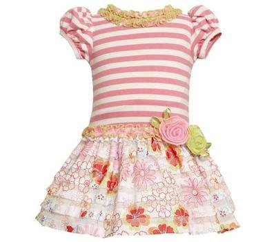 Striking and sweet pink stripe floral dress by Bonnie Jean will fast become your little girl's favorite. Darling stripes are accented with green trimmed ruffles at sleeves and waist. A green and a pink rolled rose are left centered at waist of floral print skirt. This dress is a perfect ready-cute item for a spring occasion for her or a fun play date with friends. Sizes 12M-24M include coordinating bloomer.