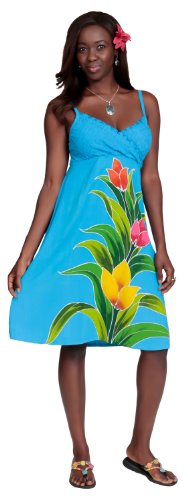 This sundress is perfect for your next occasion. Featuring a hand painted Ginger flower print, a crossover top, adjustable spaghetti straps, stretch top for both comfort and fit. Wear this long dress at the resort, on a cruise, the beach, in Hawaii or wherever your heart desires. Please note, because each dress is a handmade one of a kind work of art, you may see slight variations in design. Made in exotic Bali from 100% top quality silky smooth rayon exclusively by 1 World Sarongs.