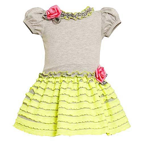 Cute lime green and grey jersey knit dress by Bonnie Jean will add a trendy feel to your little girl's spring wardrobe. Fun dress features animal print bow and rosette applique at shoulder and left-center of drop waist. Boutique-finished skirted bottom has darling lime green ruffle trim on grey jersey knit. Casual dress is not only fun to wear but very comfortable. Be sure to add this darling dress to your cart, you will be so happy you did! Sizes 0-3M through 24M have included bloomer.