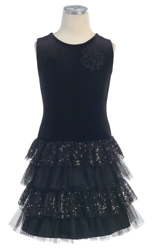 New Sequin & Mesh Tiered Holiday Christmas Party Dress; Sleeveless Stretch Velveteen Bodice with Detachable Corsage; Fantastic Fitted Drop Waist Design; Alternating Sequin & Mesh Teired Skirt