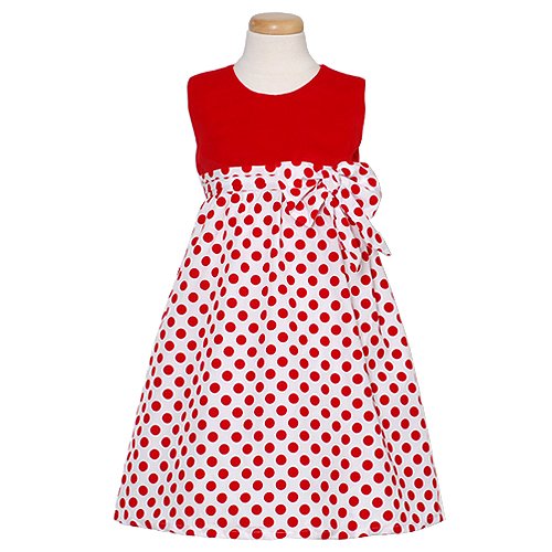 Your little girl will look adorable in this red polka dot bow Christmas dress. The sleeveless dress is red on top and the skirt is white with red polka dots throughout. There is a polka dot bow at the bodice and a bit of crinoline underneath for added fullness. The dress also features a sash tie in back and a four button closure. Great for a holiday party!