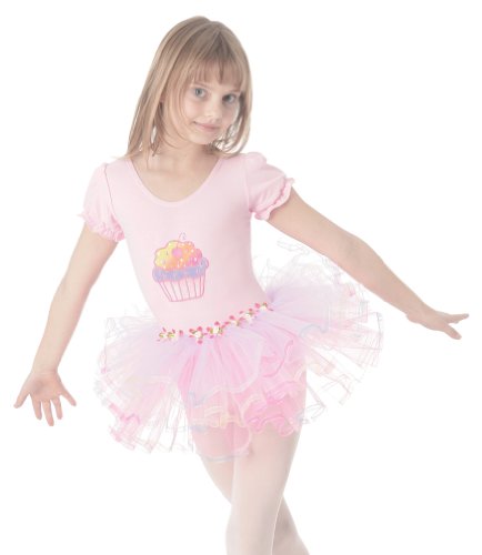 - Includes: Knit leotard with cupcake print, rosette trim, and attached tutu